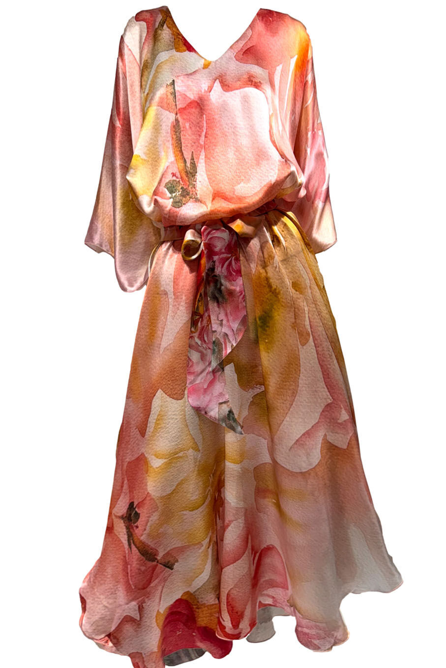 Flowers from Julia Silk Satin Maxi Kaftan — 100% silk satin, 135 cm long. Inspired by original artwork, elegant for weddings and resort wear. Pair with the matching chiffon silk scarf (sold separately) to complete the look.