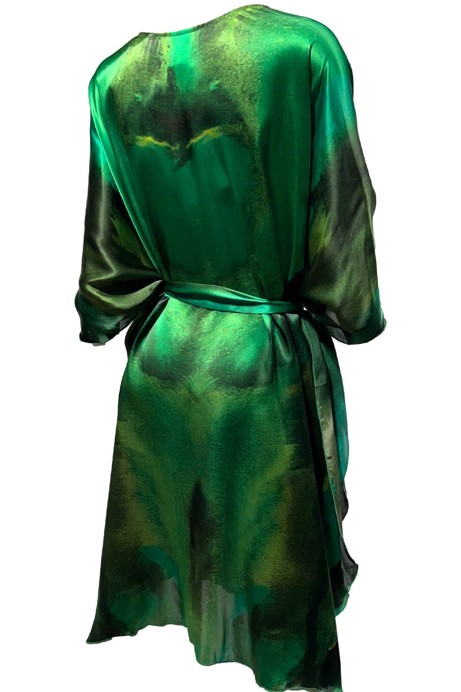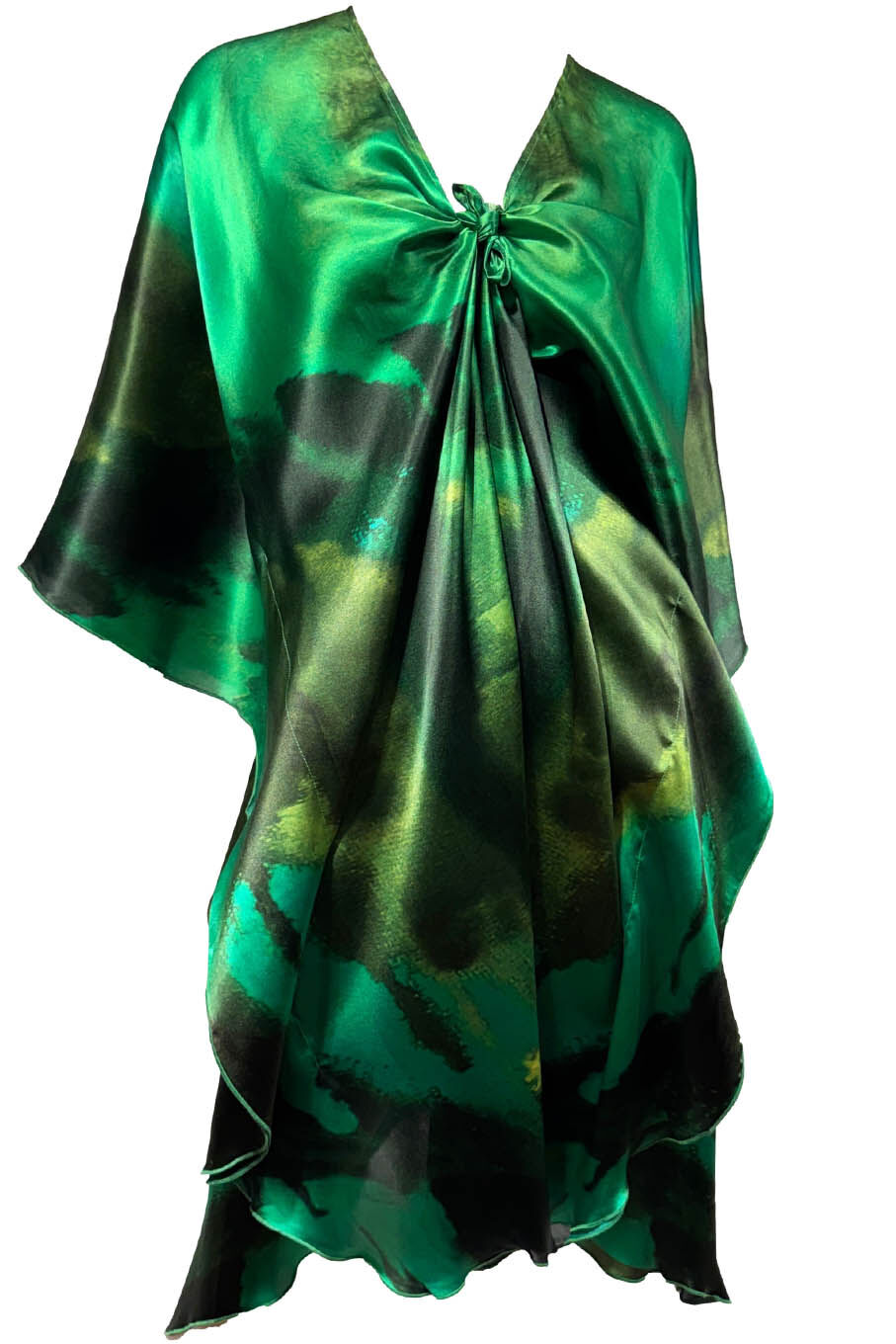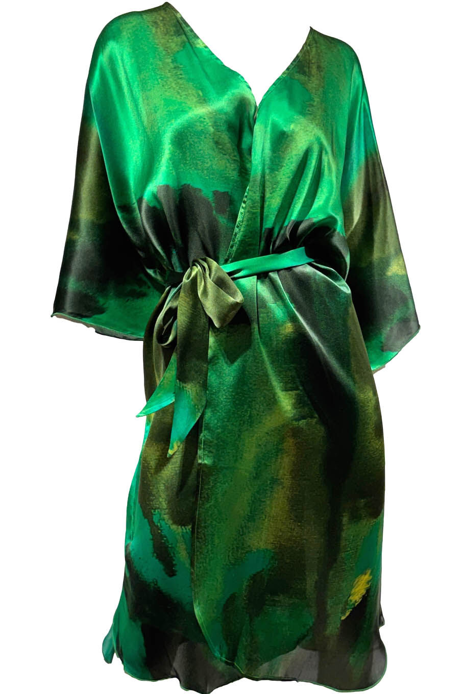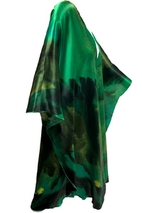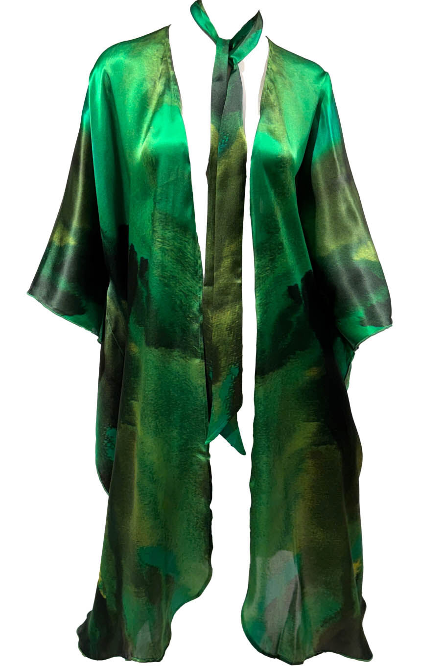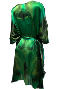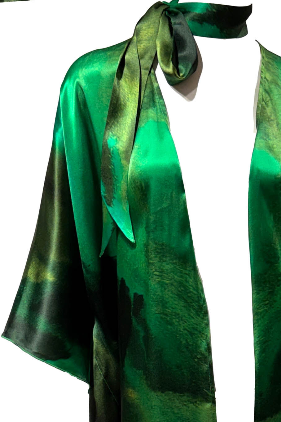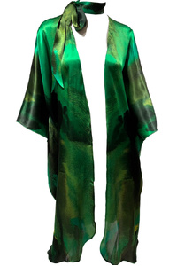 Open at the front. Wear it casually or dress it up. Comes with a Sash that could be use as belt, bow tai or bandanas. 100% Silk Crepe. Length is 100 cm. Size: O/S. Double sided. Choose to wear vivid side or faded side.
