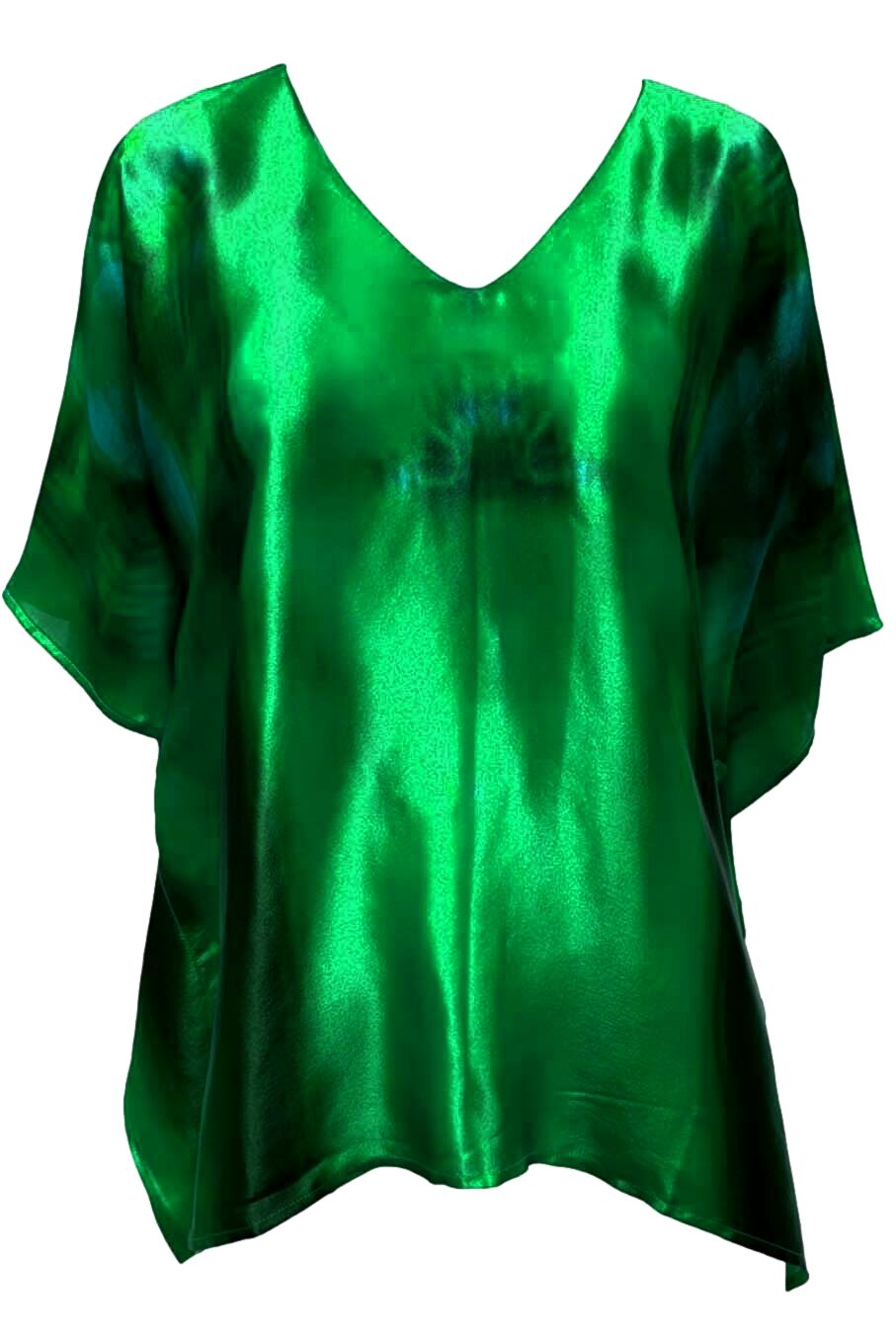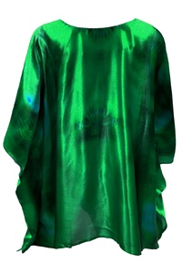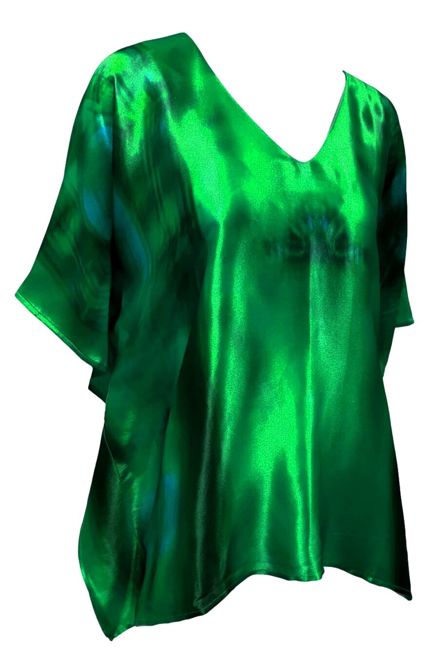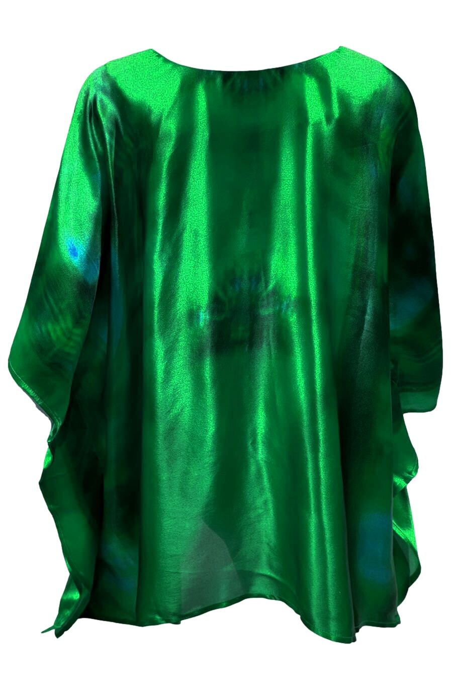 Grove Silk Poncho by JAVAD — a 100% silk satin piece inspired by Javad’s photography and transformed into wearable art. Deep green tones, fluid drape, and limited-edition design for a refined, statement look.