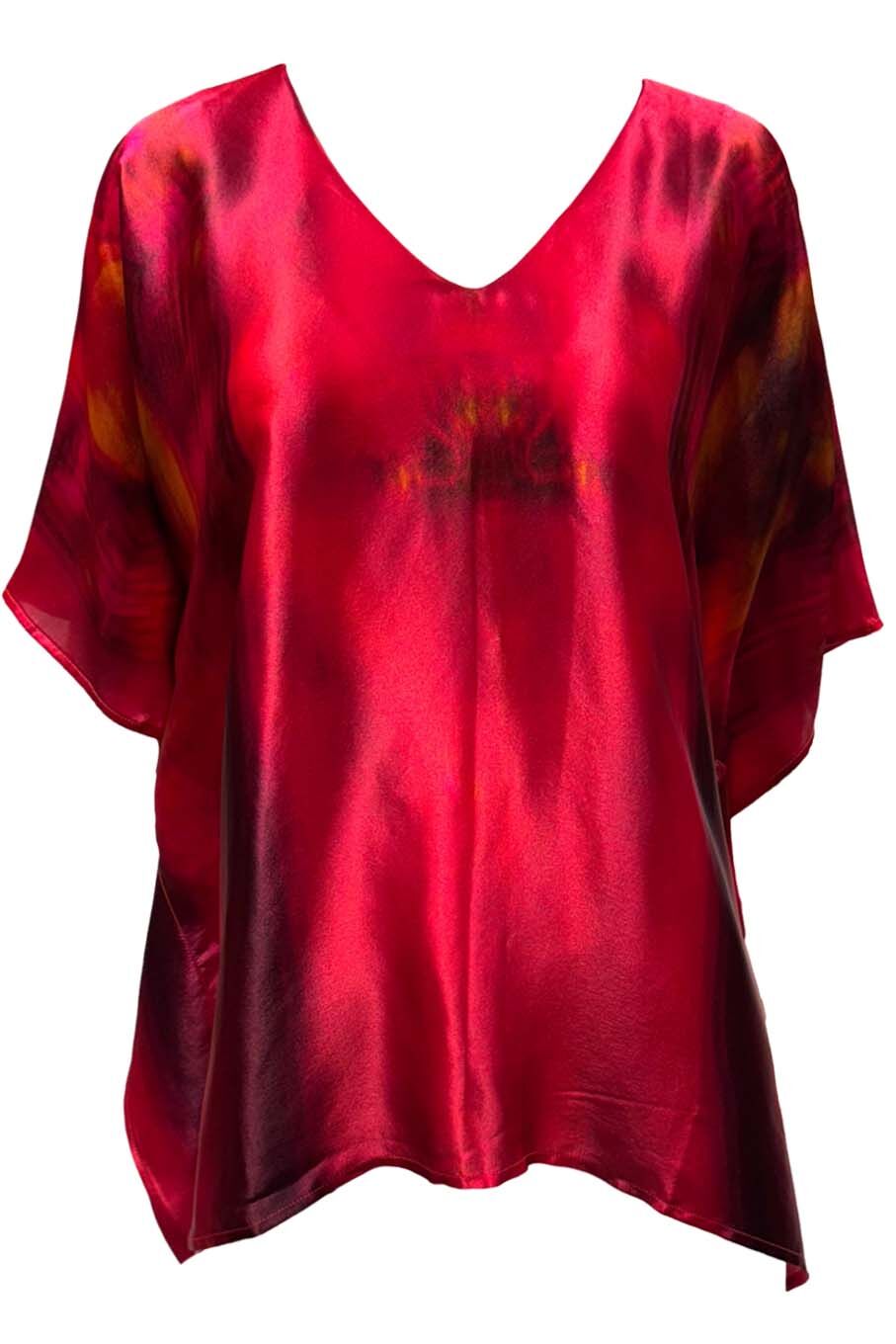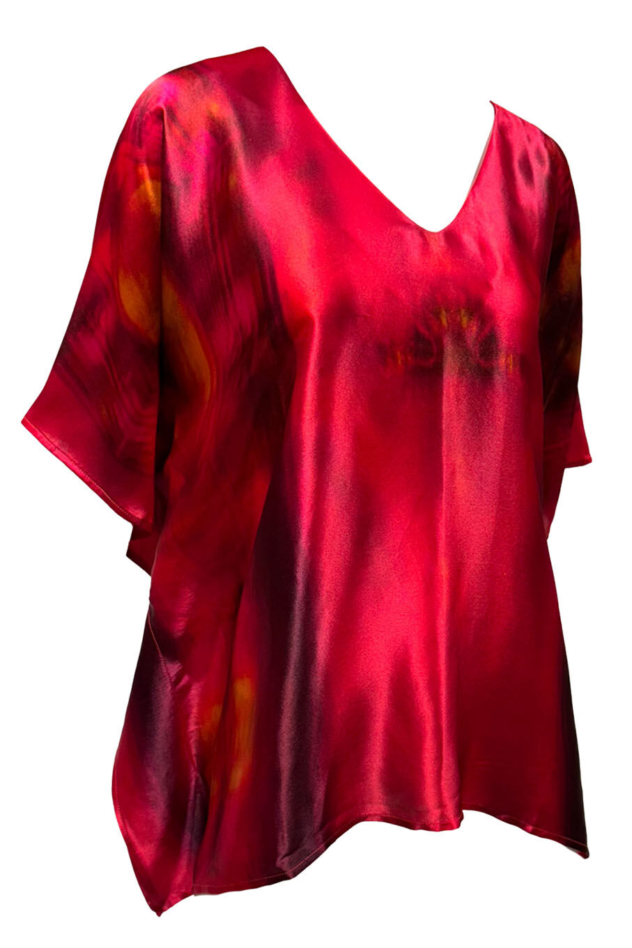 Passion Red Silk Poncho — wearable art in 100% silk satin, 68 cm long. Inspired by Javad’s photography and digital artwork, this one-size design is bold, elegant, and perfect for weddings, evenings, and resort wear.